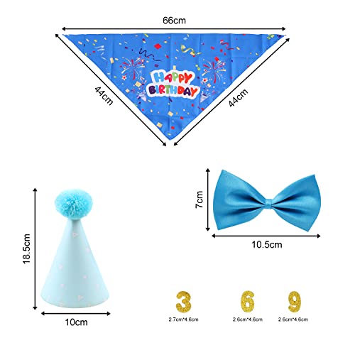 Contenuto della confezione: riceverai 1 sciarpa per animali domestici (blu), 1 papillon (blu lago), 1 cappello di compleanno a sfera (blu) e 1 set di toppe digitali in polvere d'oro da 0 a 9", un set completo per le esigenze di decorazione di compleanno del tuo animale domestico, non c'è bisogno di acquistare accessori aggiuntivi.