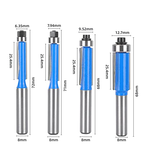 BIGP 4 Pezzi Fresa per rifinitura a Filo con Gambo da 8mm, Fresa a Taglienti Diritti per Rifilare con Cuscinetto, Fresa per la lavorazione del legno, Diametro 1/4" 5/16" 3/8" 1/2"