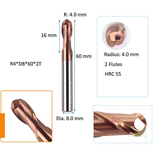 2 pezzi - Fresa per fresa a testa sferica con raggio di 4,0 mm, diametro del gambo 8,0 mm, fresa durevole al tungsteno HRC 55 per rivestimento in metallo acciaio ferro TiAIN