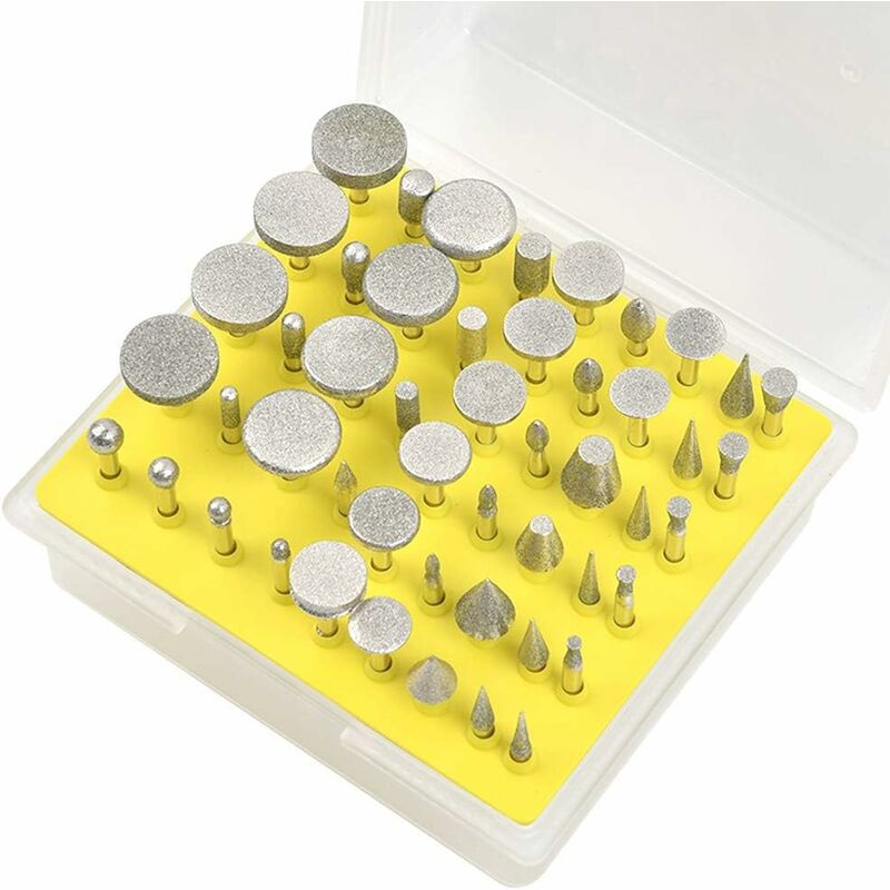 【Multifunzione】Le frese diamantate sono ampiamente utilizzate per intaglio, molatura, lucidatura e altre operazioni su legno, metallo, vetro, gioielli, giada, pietra, ceramica e altri materiali. 【Robusto e materiale durevole: realizzato in acciaio 45#, che presenta un'elevata durezza e un'elevata resistenza alla deformazione. Con punta diamantata, resistente all'usura e durevole, le frese rotanti mostrano un buon effetto di lucidatura. 【Specifica】 Testa diamantata con un gambo di circa 3 mm, la lunghezza totale è di 4,5 cm, grana 320 per lavori di dettaglio.Adatto per utensili rotanti elettrici Dremel o macchine per incidere. 【Forme della testa diamantata】Le teste di levigatura hanno principalmente le seguenti forme: testa piatta forma cilindrica, forma cilindrica a testa tonda, sferica, a forma di ombrello, a forma di sfera, trapezoidale rovesciato, ago appuntito, ecc. 【Set di frese diamantate】 50 testine di rettifica di diverse forme e dimensioni in una scatola di plastica, puoi