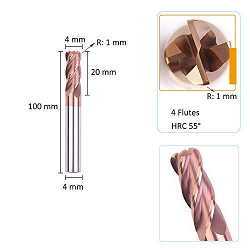 2 pezzi Frese a raggio angolare Diametro di taglio 4,0 mm, lunghezza lunga 100 mm, angolo Raidus 1,0 mm, 4 taglienti, fresa HRC 55 per ghisa in acciaio e metallo