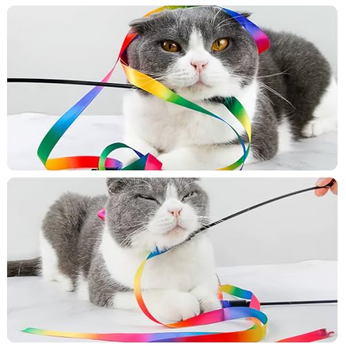 【Kit giocattolo colorato per gatti】 Riceverai 3 bacchette per gioco gatto nella confezione. Il nostro bastone giocattolo per gatti con un bastone lungo 30 cm e una striscia di stoffa colorata lunga 60 cm. Tre diversi stili di fasce colorate per gattini arricchiscono le tue opzioni. I tuoi gatti si innamoreranno di questo giocattolo interattivo per gatti con nastro.