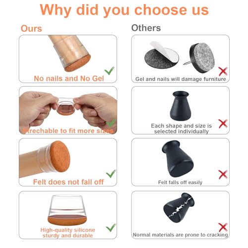 【Il feltro non cadrà mai】 I nostri coprigambe per sedia sono progettati in modo tale che il cappuccio e il feltro siano permanentemente uniti insieme. Ciò significa che non dovrai più preoccuparti che i feltrini scivolino o che i capelli si attacchino agli adesivi. Le tue sedie scivolano senza sforzo su pavimenti in legno, laminato o piastrelle!