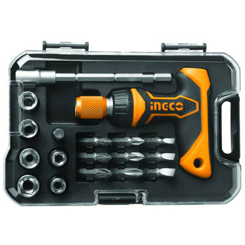 Il set di cacciaviti con impugnatura a T Ingco è composto da 18 pezzi, contenuti in una pratica scatola di plastica. Ci sono 9 bit con attacco 6,35x25mm, tra cui SL4, SL5, SL6, PH1, PH2, PH3, PZ1, PZ2 e PZ3. Inoltre, il set comprende un porta bit magnetico da 5x100mm, un adattatore da 4-6mm (25mm), 6 bussole da 1/4 con le dimensioni di 5mm, 6mm, 7mm, 8mm, 9mm e 10mm. Infine, c'è un'impugnatura a cricchetto a forma di T che rende più facile l'utilizzo dei cacciaviti. Questo set è ideale per chi cerca un set di cacciaviti completo per svolgere lavori di precisione. SET 18 PEZ C/IMPUGNATURA A T INGCO Set cacciaviti 18 pz 9pz 6,35X25mm Bit: SL4, SL5, SL6, PH1, PH2, PH3, PZ1, PZ2, PZ3;