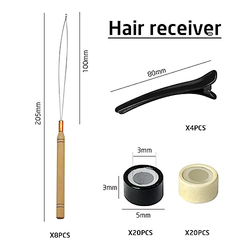 8 pezzi di infila per capelli, 4 clip per becco d'anatra, 40 pezzi di anelli di estensione per capelli, con manico in legno, extension per capelli fai da te