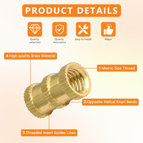 【Ampia applicazione】 I dadi con inserti filettati sono adatti per stampaggio a iniezione, assemblaggio di circuiti stampati, prodotti elettronici e accessori filettati per la maggior parte dei dispositivi di fissaggio in plastica e possono essere inseriti in varie plastiche