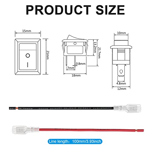 Tipo di prodotto: 10 interruttori a bilanciere neri tipo barca, lunghezza del cavo: 100mm, tipo: 2 pin, SPST ON / OFF. Dotato di 10 coperture trasparenti antipolvere e impermeabili.