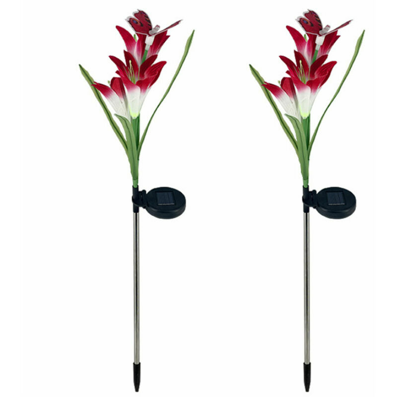 2 bellissime luci di fiori da giardino artificiali solari per esterni, 4 gigli in una confezione. batteria solare ricaricabile, 7 colori cambiano automaticamente, steli e foglie regolabili. La luce solare da giardino si illumina al buio per illuminare il tuo giardino e il tuo percorso, può portare una migliore illuminazione d'atmosfera. Caratteristiche: Giglio solare dal design accattivante, leggero e resistente. IP55 impermeabile. Dotata della batteria ricaricabile da 600 mAh, questa luce solare può funzionare per circa 6-8 ore di notte se completamente carica durante il giorno. La gomma che racchiude l'interruttore può proteggere da acqua e polvere, per garantire una ricarica efficiente. Una volta acceso il pulsante, le luci solari si cancelleranno automaticamente in diversi colori (7 colori cambiano automaticamente). Le aste morbide supportate da filo di ferro da 0,35 mm miglioreranno la flessibilità, puoi facilmente piegare il fiore nello stile più bello che ti piace. Facile da