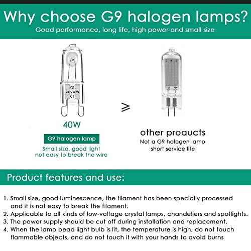 Materiale:Lampadine G9 fatto di vetro di quarzo, resistenza alle alte temperature, buon isolamento, lunga durata, può essere usato per 2000 ore.