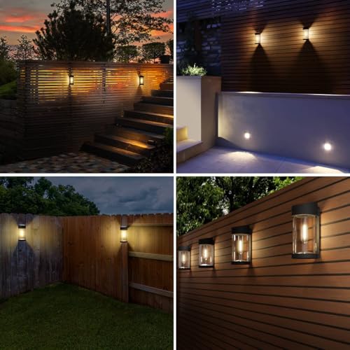 【4 Pack Luci Solari da Esterno】Le luci solari da parete da esterno combinano stili moderni e vintage e sono realizzate in robusto materiale ABS e vetro trasparente per una maggiore durata. Le lampadine utilizzano lampadine a LED che emettono una morbida luce bianca calda di 3000K dopo il tramonto per rendere patii, giardini, terrazze, ringhiere, pareti e ambienti ancora più belli.