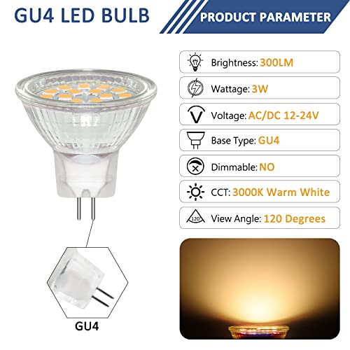 6 Pezzi Lampadine Spot GU4 LED 3W, Bianco Caldo 3000K, Equivalente a Lampada Alogena 20W 30W, 300LM, AC/DC 12V-24V, Fascio 120°, con Vetro Protettivo Trasparente, Non Dimmerabile