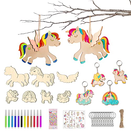 Set di 52 pezzi in legno per dipingere, forma incompiuta, ritagli in legno con penna ad acquerello, portachiavi, set fai da te in legno, in legno a ferro di cavallo, fai da te per bambini