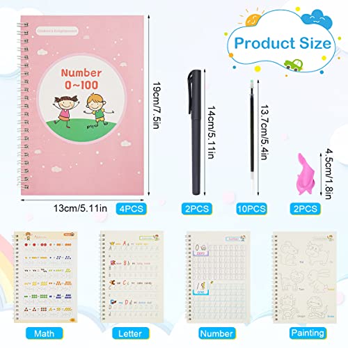 4 Pezzi Libro Magico da Scrivere per Bambini con Penna, Ausili, Riutilizzabile Groove Calligraphy World 19X13cm Magic Calligraphy, Calligrafia Magica con Alfabeto Inglese, Matematica
