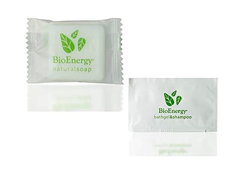 Kit 400 pezzi linea cortesia Bio Energy 200 saponette gr.15 + 200 bustine shampoo doccia ml.10 per Albergo, Hotel e B&B.