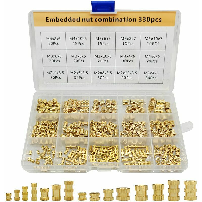 Specifiche: Nome prodotto: kit assortimento di dadi filettati in ottone zigrinato. Materiale: ottone Colore: oro Quantità: 330 pezzi Altezza: 4 mm, 6 mm, 8 mm, 10 mm Diametro interno: 2 mm, 3 mm, 4 mm, 5 mm Diametro esterno: 3,5 mm, 5 mm, 6 mm, 7 mm < br/> Vantaggio: 1. Uniforme spaziatura, linee chiare, forza uniforme, alta resistenza, più forte. 2. Superficie liscia senza sbavature, standard circolare, ferma e uniforme, facile da installare. 3. Non facile da arrugginire, forte resistenza alla corrosione. 4. Non c'è bisogno di svasare o svasare il foro sporgente poiché l'inserto ha un pilota di guida. 5. Confezionato in una pratica custodia di plastica con chiusura a zip.: 【M2】 M2 x 4 x 3,5 mm-- -30 pezzi M2 x 6 x 3,5 mm- - -30 pezzi M2 x 8 x 3, 5 mm- - -30 pezzi M2 x 10 x 3,5 mm- - -20 pezzi 【M3】 M3 x 4 x 5 mm - -30 pezzi M3 x 6 x 5 mm- - --30 pezzi