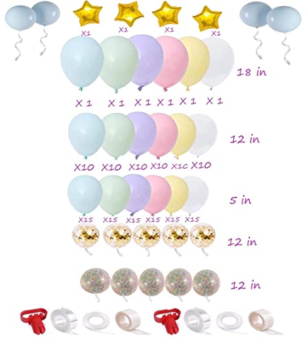 ★La ghirlanda di palloncini arcobaleno include-1 * 18 pollici (palloncini bianchi, rosa, blu, gialli, verdi e viola). 10*12 pollici (palloncini Sei colori ). 15 * 5 pollici (pallonciniSei colori ). 5 * 12 pollici (palloncini glitter dorati e palloncini in schiuma multicolore). Palloncino in pellicola di alluminio 4*10 a stella. 2 * (nastro adesivo decorativo per palloncini + colla per punti + nastro lungo + strumento per legare palloncini).