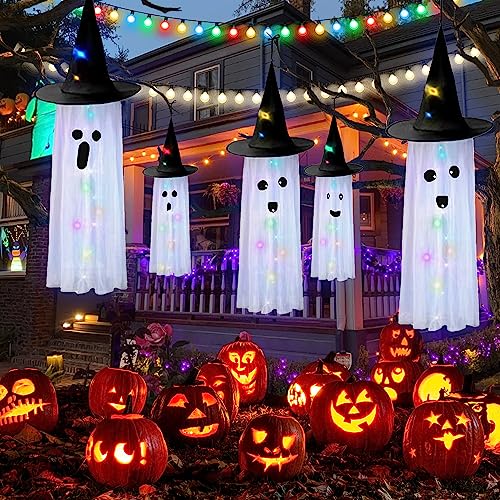【Design perfetto】: questa decorazione di Halloween ha stampe di fantasmi su entrambi i lati, ogni cappello da strega è dotato di un pulsante, quindi puoi accendere immediatamente l'interruttore per decorare il tuo giardino, la combinazione perfetta di fantasmi e luci, illumina il tuo Halloween e benvenuto al tuo adorabile vicino.