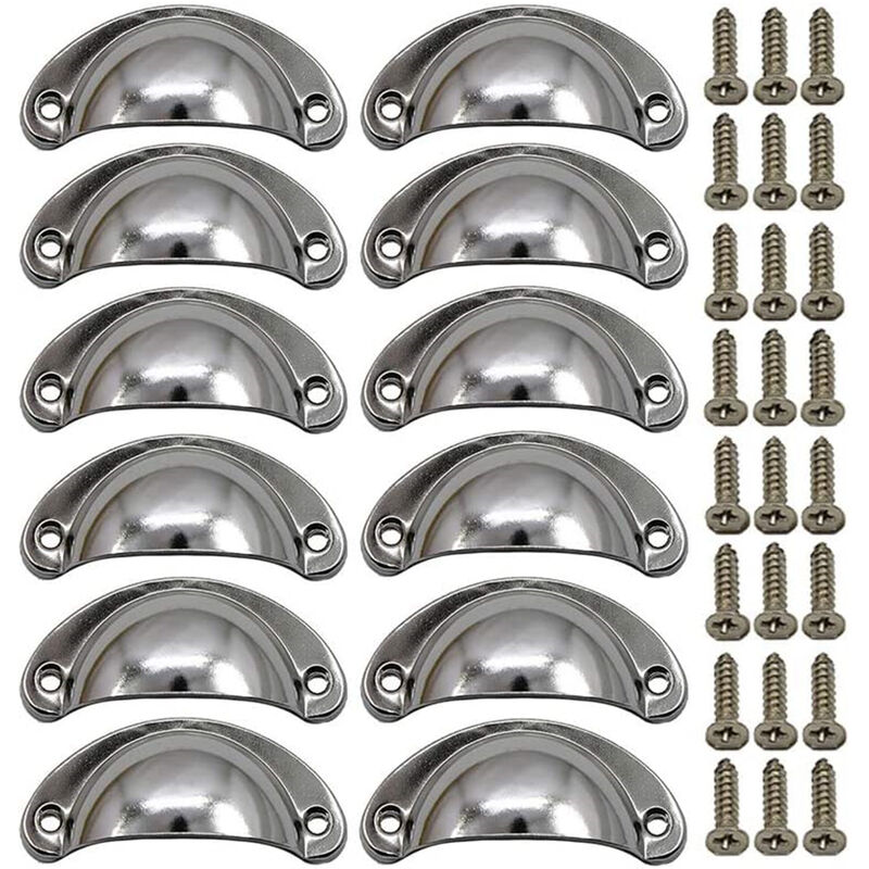 Set di 12 maniglie in argento (82 x 35 mm) con viti incluse. Il design antico, a forma di conchiglia, mostra il tuo gusto personale unico. Queste maniglie possono dare ai tuoi mobili un aspetto completamente nuovo. Questa maniglia di ricambio per mobili è perfetta per porte, armadi e cassetti.