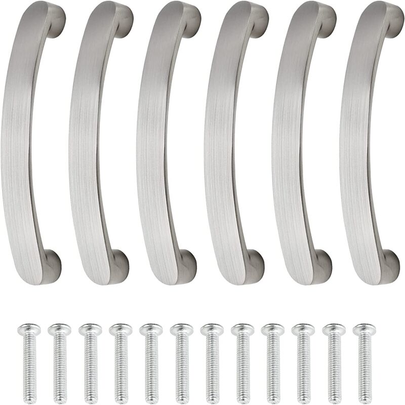 Set di 6 maniglie per armadio, distanza tra i fori 160 mm, lunghezza totale 175 mm, altezza 23 mm. --Queste maniglie per mobili in lega di alluminio sono resistenti e non facili da ossidare. --La finitura in nichel spazzolato combinata con il classico aspetto ad arco emana un'eleganza sobria che completa qualsiasi mobile. --Può essere utilizzato in cucina, soggiorno, camera da letto, adatto per armadi, cassetti e altri mobili.