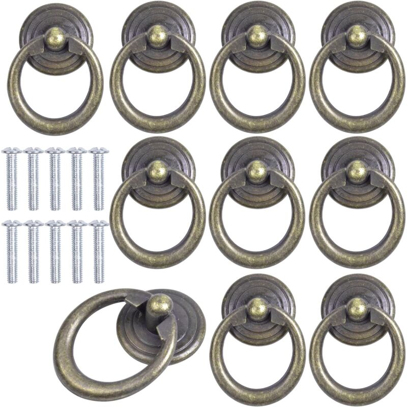 1,10 Anello per armadi 42 x 30 mm con 10 viti lunghe 22 mm. Adatto alla maggior parte dei cassetti, armadi, ante di armadi, cassettiere e cucine. 2. Le maniglie ad anello sono realizzate in lega di zinco e sono robuste e resistenti alla corrosione. Superficie liscia, senza bave o spigoli vivi. 3. La superficie è zincata e verniciata in bronzo invecchiato per una finitura liscia e uniforme. I pomelli delle porte sono resistenti e possono essere utilizzati a lungo. 4. L'anello del pomolo si aggancia naturalmente alla superficie del mobile senza sporgere, riducendo il potenziale rischio di urti accidentali da parte di bambini o anziani. 5. Il design dell'anello di trazione rotondo è comodo per aprire cassetti e ante di armadietti: basta tirare delicatamente l'anello e anche i bambini piccoli possono aprirlo facilmente.