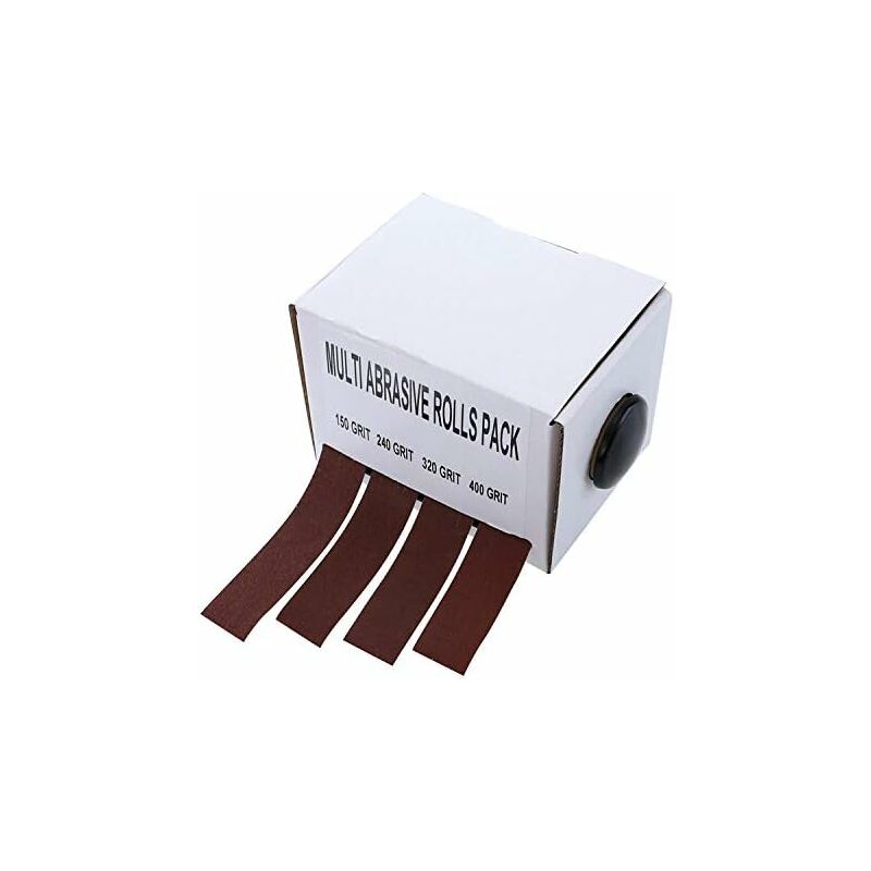 Specifiche: materiale: carta vetrata. 4 rotoli/scatola, 4 misure: grana 150, grana 240, grana 320, grana 400, ogni dimensione volume: 25mm*6m. Scatola nastro abrasivo secco, nastro abrasivo sabbia resistente all'usura, panno abrasivo morbido, panno di nylon sul retro, resistenza alla trazione. Per la molatura & lucidatura di varietà di superfici sagomate e amp;