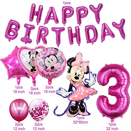 【Kit di Decorazioni per Feste Minnie】: 1 Palloncino Minnie Rosa 3 Anni + 2 Palloncini Foil Rotondi Minnie + 2 x 18 pollici palloncini in alluminio a forma di cuore, + 1 Banner Di Buon Compleanno + 4 x 12 pollici palloncino in lattice + 1 x 32 pollici palloncino in alluminio numero "3" + 1 x palloncino a forma di stella +1 x nastro palloncino