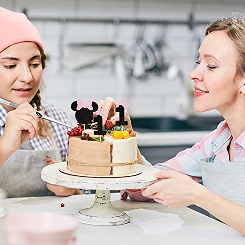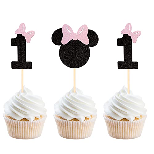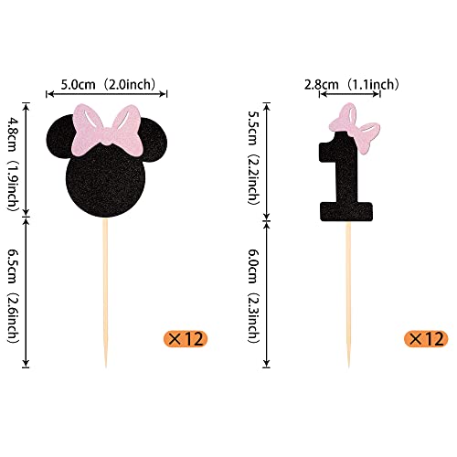 24 pezzi Minnie Mouse ispirato compleanno decorazione torta mini 1 compleanno cupcake topper mini Happy Birthday decorazione torta con fiocco, mouse per mini 1st Happy Birthday Party rosa e nero
