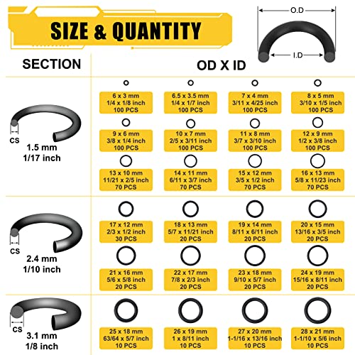 【DIMENSIONI MULTIPLE】: questo set di O-Ring include 1290 pezzi, che ha 24 diverse dimensioni e 3 spessori di o-ring universali in gomma. La quantità è più che sufficiente per coprire tutte le vostre esigenze e fornire una buona tenuta. Le etichette delle dimensioni corrette e di facile lettura rendono più veloce la ricerca della taglia di cui hai bisogno.