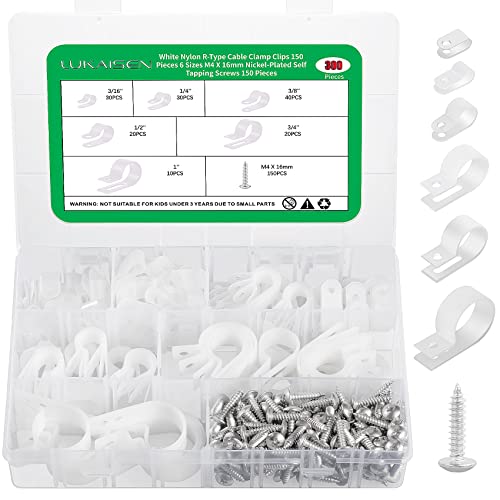 Clip per Cavi, 300 Pezzi Organizer a Clip per Cavo, Clip in Plastica Nylon bianco Fermacavo Clip, 4.76/6.35/9.53/12.7/19/25.40mm Clip Cavo per Organizare Clip con viti M4 x 16 mm nichelate indurite