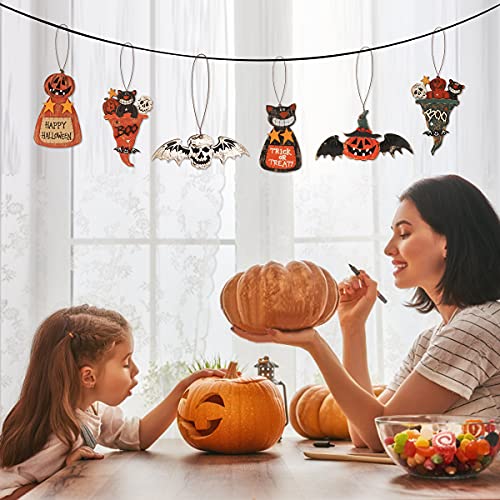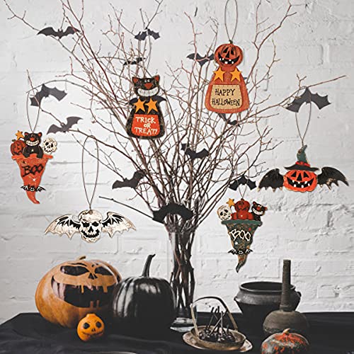 Ornamenti di legno di Halloween:Il pacchetto include 6 pezzi di ornamenti appesi in legno di Halloween in diversi stili, ogni pezzo di ornamento in legno è intagliato e dipinto artificialmente.Le fette di legno appese misurano ca. 5 cm-14,5 cm. Le forme e i colori classici di Halloween aggiungono un tocco di atmosfera al festival di Halloween e ti fanno divertire alla festa.