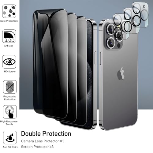 3+3 Pezzi - Pellicola Privacy per iPhone 15 Pro Max e Pellicola Fotocamera, Pellicola Prottetiva Anti Graffio, Vetro Temperato Film Anti-Spy, Senza Bolle, Vetro Protettivo per iPhone 15 Pro Max