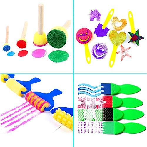 29 diverse forme e misure di spazzole (1 pennello fine +1 Sponge pala + 4 pennelli per pittura di fiori+ 4 spazzole spugna a rullo + 4 spazzole a rullo in spugna + 5 Pennello rotondo in spugna + 4 pennello spugna lungo + 6 breve spugna pittura stamper ) e +1 Borsa, Con loro bambini può creare liberamente diversi modelli per stimolare l'immaginazione e la creatività dei bambini.