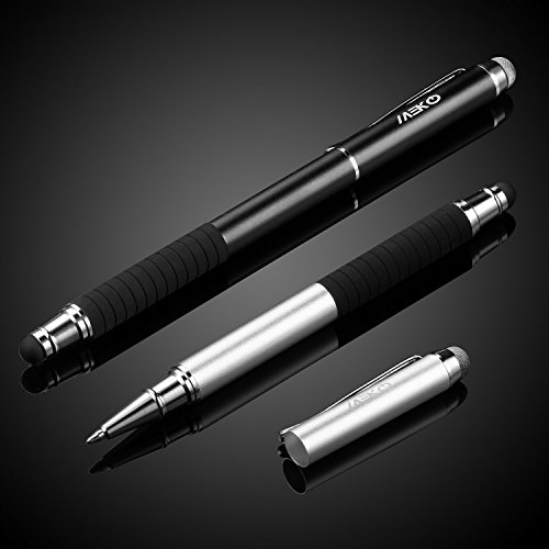 MEKO 2 Pezzi 3 in 1 Pennino Capacitivo/Penna Capacitiva Penne a Sfera in Metallo Barrel con 4 Punte per Tutti Gli Smartphone e Tablet Touchscreen, Ufficio Usa (Argento / Nero)