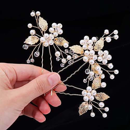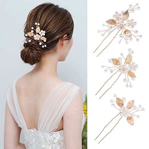 3 Pezzi Perle da Sposa Fermagli per Capelli Foglie Tiara Pearl Bridal Wedding Hair Clips da Sposa Fiore Accessori Mollette per Capelli da Sposa e Damigelle d'onore (oro)