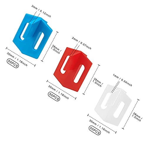 4. Informazioni sulla confezione: ci sono 50 distanziatori per piastrelle bianche, 50 distanziatori per piastrelle rosse, 50 pezzi di distanziatori per piastrelle blu in totale, varie dimensioni per soddisfare le diverse esigenze.