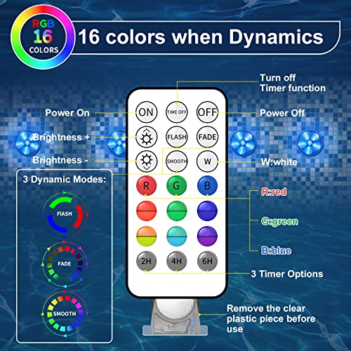 【16 luci LED sommeisibili per piscina telecomandate】 Premere il pulsante remoto: le luci colorate per piscina hanno 16 colori dinamici (bianco, rosso, verde, blu, ecc. ), 3 modalità di cambio colore (flash, dissolvenza, liscio), 3 pulsanti timer (2h, 4h, 6h) e 3 livelli di luminosità regolabili, funzione di memoria. Un telecomando controlla tutte le luci della festa in piscina. Facile da usare