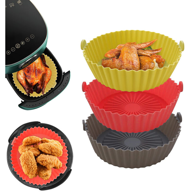 e il design del fondo a strisce può migliorare la circolazione dell'aria e trasferire uniformemente il calore al cibo per tempi di cottura più brevi. Facile da pulire: basta capovolgerlo e lavarlo con acqua tiepida, molto facile da pulire ed è anche sicuro per la lavastoviglie, permettendoti di evitare il fastidio del lavaggio a mano. Ampia applicazione: adatto per friggitrice ad aria, microonde, forno, vaporiera, ecc., campeggio, barbecue e così via, molto pratico e conveniente. Specifiche: Colore: blu/giallo/grigio scuro/rosso (opzionale) Dimensioni: 5,7 pollici (14,5 cm) Materiale: silicone Intervallo di temperatura: da -20℃ a