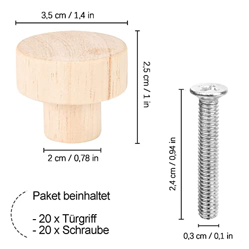 20 pezzi Pomelli per Mobili Legno, 35 MM Armadietto Maniglia Rotonda in Legno con 20 Viti, per Cassetti, Comodino