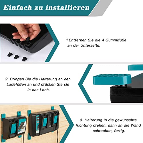1. Applicazione: adatto per caricabatterie doppio Makita DC18RD e per Makita DC18RC DC18RA DC18SC DC18RF DCB18SD caricabatterie singolo e per Makita DC18SF 4 porte per il fissaggio a parete, banco da lavoro, garage, officina, veicolo da lavoro, uso per il fissaggio e fuori strada, consentono una maggiore superficie di lavoro.
