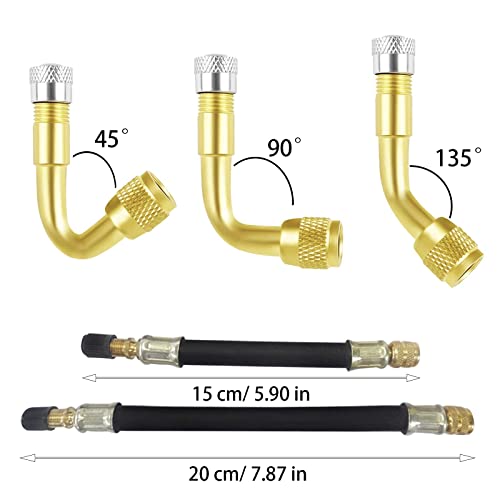 Prolunga valvola: questo set di aste di prolunga per pneumatici ha 3 angoli, 45 gradi, 90 gradi e 135 gradi tra cui scegliere. I giunti di prolunga della valvola sono lunghi 150 mm e 200 mm, il che risolve con successo il problema che non può essere controllato con una pompa a pedale .