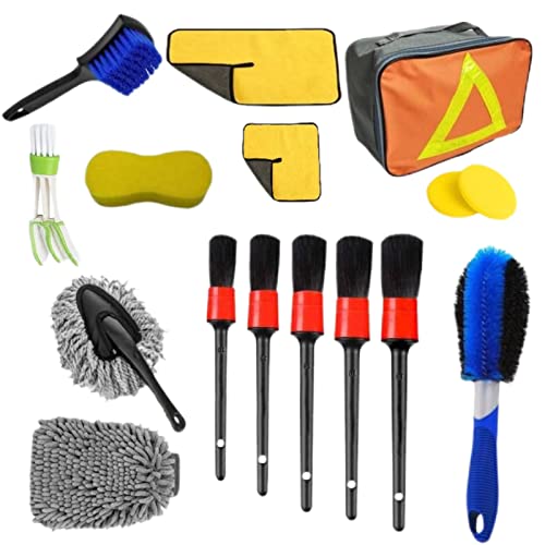 【16-in-1 Kit per la cura dell'auto】5 diverse dimensioni di spazzole per dettagli (con seta PP, materiale in setole) (10 # lunghezza 20,96 cm, 12 # lunghezza 22,86 cm, 14 # lunghezza 22,86 cm, 16 # lunghezza 23,49 cm, 18 # lunghezza 23,49 cm), 2 spugne, spazzola per ruote, spazzola per polvere grigia, spazzola per uscita condizionatore d'aria, asciugamano per lavaggio 30 * 30 cm, asciugamano per lavaggio auto 30 * 60 cm, guanti per lavaggio, spazzola per pneumatici, panno oxford