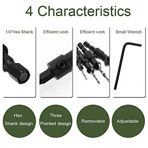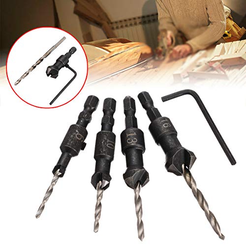 YUET 5 Pezzi Punta da Trapano Svasatore per Legno, 6#10#13#16 Codolo Esagonale Regolabile da 1/4" Trapano a Cambio Rapido HSS, con Chiave Esagonale, Punte Coniche per Legno, Plastica