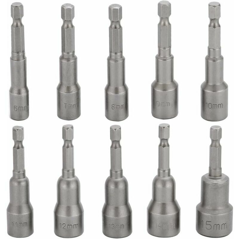 Diverse dimensioni della presa - 10 diverse dimensioni, 6 mm, 7 mm, 8 mm, 9 mm, 10 mm, 11 mm, 12 mm, 13 mm, 14 mm, 15 mm. Questa punta per cacciavite soddisfa tutte le tue esigenze e si abbina perfettamente ai tuoi strumenti.Questo set di prese esagonali magnetiche ha diverse dimensioni e forme per adattarsi al tuo strumento tra cui scegliere. [Materiale] La presa per cacciavite è realizzata in acciaio al cromo vanadio di alta qualità (CR-V). Ha elevata durezza, buona resistenza all'usura, resistenza all'ossidazione e resistenza alla frattura. Resiste ad elevate sollecitazioni di flessione. La presa della punta del cacciavite è estremamente resistente. [Facile da installare e smontare] Il forte magnetismo della punta della presa può essere perfettamente abbinato al tuo strumento, regolazione rapida, presenta meno usura, strappi e strappi. ;