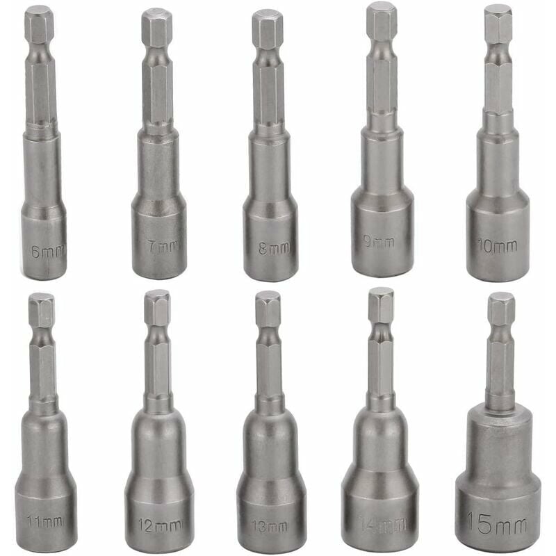 Diverse dimensioni della presa - 10 diverse dimensioni, 6 mm, 7 mm, 8 mm, 9 mm, 10 mm, 11 mm, 12 mm, 13 mm, 14 mm, 15 mm. Questa punta per cacciavite soddisfa tutte le tue esigenze e si abbina perfettamente ai tuoi strumenti. Questo set di prese esagonali magnetiche ha diverse dimensioni e forme per adattarsi al tuo strumento tra cui scegliere. [Materiale] La presa del cacciavite è realizzata in acciaio al cromo vanadio premium (CR-V). Ha elevata durezza, buona resistenza all'usura, resistenza all'ossidazione e resistenza alla frattura. Resiste ad elevate sollecitazioni di flessione. La presa del cacciavite è estremamente resistente. [Facile da installare e smontare] Il forte magnetismo della punta della presa può essere perfettamente abbinato al tuo strumento, regolazione rapida, minore usura, facilità di installazione e caratteristiche di forza magnetica super forte rendono il set di prese più facile da usare. [Ampie applicazioni] Questo set di prese esagonali magnetiche è