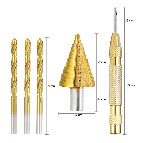 5 Pezzi Punte a Gradini, Fresa Conica Trapano a Gradini, Punte Coniche, HSS Titanium, 5-35, Buco Cutter a Scalini con Punzone Centrale Automatico per Eseguire Foro in Metallo Legno Plastica