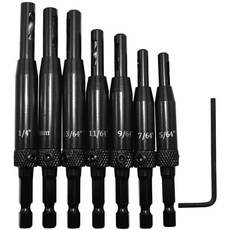 7Pcs Centro Drill Bit Doors Auto Centraggio Charni re Tapper Hole Puncher Wood Tools Punto di vendita del prodotto: Il gambo del trapano in acciaio inossidabile è spesso 1/4". Adatto per maschiare la finestra o porta di legno. Si tratta di un composito di sostituzione rapida, utilizza il principio del tagliente del trapano. Foratura e maschiatura, alta efficienza di lavoro. Elevata durezza, antiruggine, forte e durevole. Precisione di posizionamento, non si sposta, i trucioli si scaricano automaticamente su entrambi i lati della parte superiore del foro, non attaccare il trapano. Istruzioni per l' uso: Si prega di regolare in base alla durezza del legno, se il legno è tenero, si prega di scegliere una dimensione più piccola;
