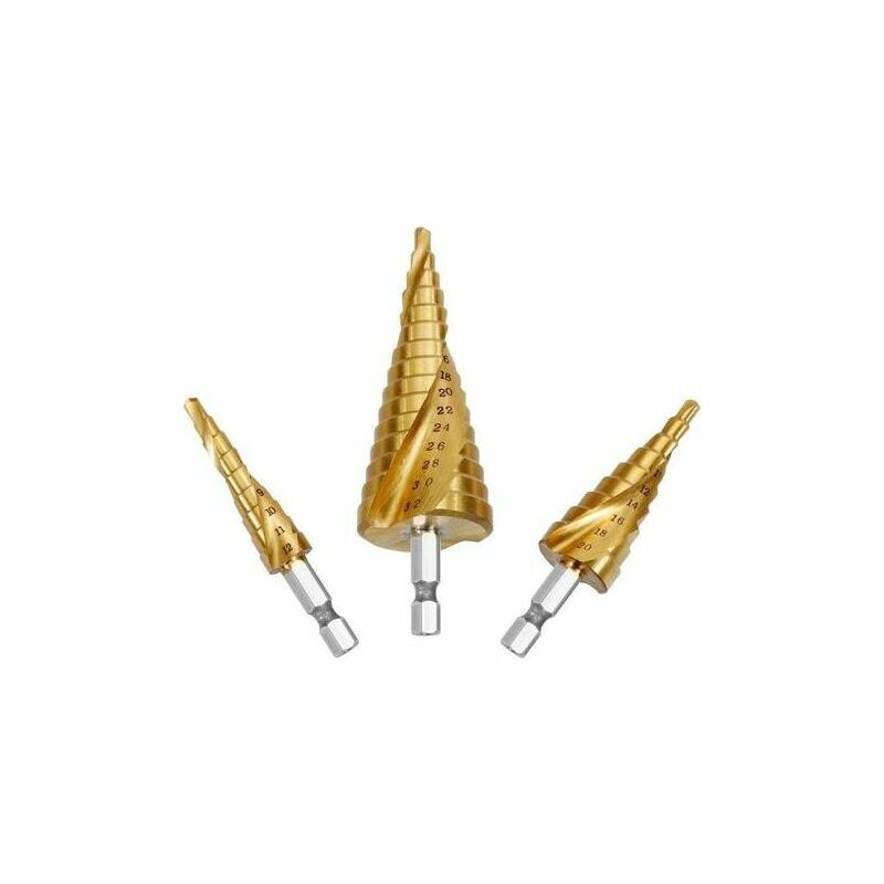 Questo set di punte da trapano contiene 3 dimensioni: 4-12 mm, 4-20 mm e 4-32 mm, fornite con una borsa di stoffa portatile. Il design a due scanalature fornisce una perforazione più con una leggera pressione i set possono tagliare legno, plastica e altre superfici di spessore inferiore a 5 mm. Design della punta conica "Step" per la foratura di precisione di fori di diverse dimensioni da 4 mm a 32 mm di diametro, massima velocità e precisione. Punte per trapano in acciaio ad alta velocità in titanio e applicazione: alta acciaio rapido con rivestimento in titanio per una comprovata capacità e durata nei fori in plastica, alluminio, rame e molti altri tipi di lamiera. La punta in titanio è particolarmente adatta per parti in rame e alluminio / acciaio per stampi / acciaio per molle / parti in ghisa / ferro e altri materiali metallici. Montaggio rapido: 1/4 (6, 35 mm) SHANK HEX funziona con la maggior parte dei trapani o trapani con mandrino 1/4. Dettagli Materiale: superficie in