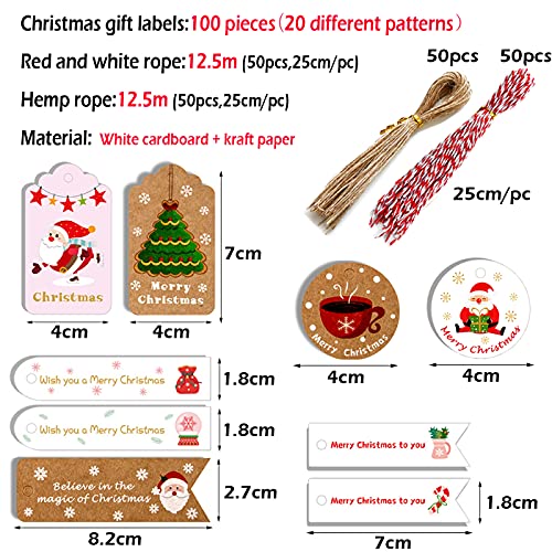 Contenuto della confezione: 100 etichette di Natale con 20 decorazioni natalizie, ogni disegno con 5 pezzi, nel frattempo viene fornito con 100 corde sufficienti per questo Natale.