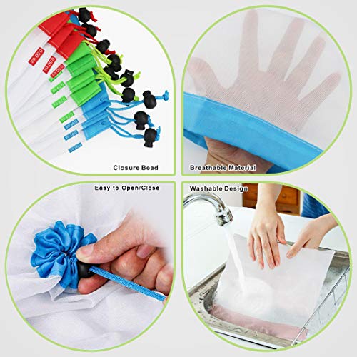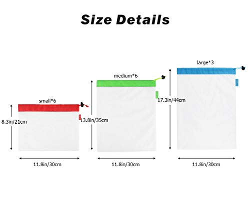 Multi formato: 3 diverse dimensioni della borsa possono essere distinte da coulisse ed etichette con colori diversi. Un set di 15 pezzi di cui 3 pezzi di grandi dimensioni (43,2 x 30,5 cm), 6 pezzi di medie dimensioni (35,6 x 30,5 cm), 6 pezzi piccoli (20,3 x 30,5 cm). Varietà di dimensioni per adattarsi a frutta o verdura di qualsiasi dimensione.