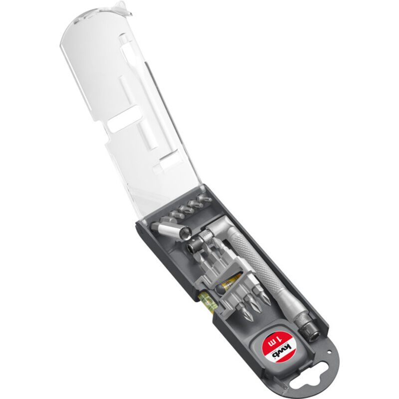 Robusta valigetta in plastica Bolla integrata per misurazioni verticali e orizzontali 1 giravite a squadra manuale con 2 inserti Astuccio inserti posizionabile per facile presa degli inserti 1 metro a nastro con scala in cm e pollici Portainserti magnetico 1/4" e 11 diversi inserti in acciaio al cromo-vanadio Il giravite a squadra non ?½ adatto al'impiego con avvitatori ad accumulatore o trapani